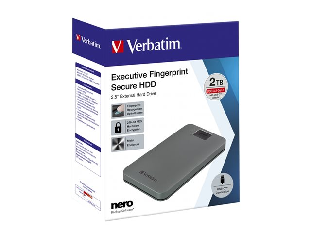 Verbatim Executive Fingerprint Secure - Disque dur - chiffré - 2 To - externe (portable) - USB 3.2 Gen 1 (USB-C connecteur) - AES 256 bits