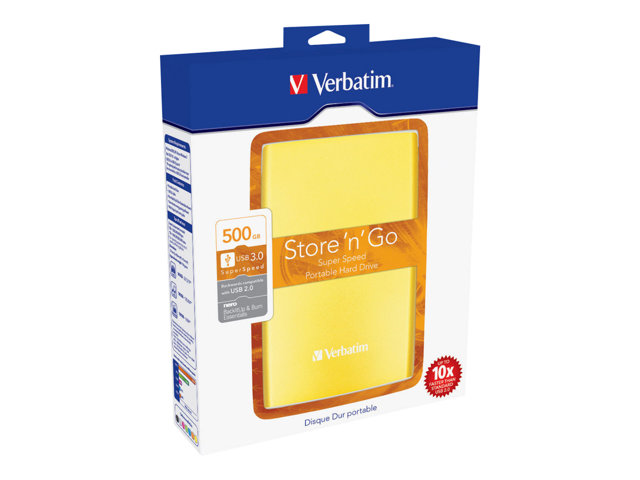 Le disque dur portable Verbatim Store 'n' Go est une solution de stockage hautes performances qui utilise une interface USB 3.0 haute vitesse. La norme USB 3.0 permet d'atteindre des débits multipliés par 10 par rapport à l'USB 2.0 (sur la base de mesure de la vitesse de bus USB), vous offrant un taux de transfert de données ultra-rapide.